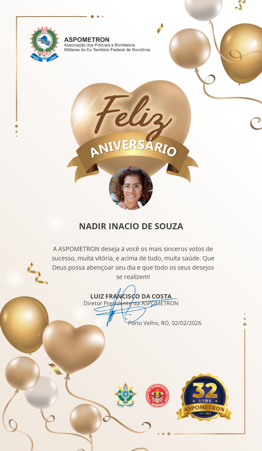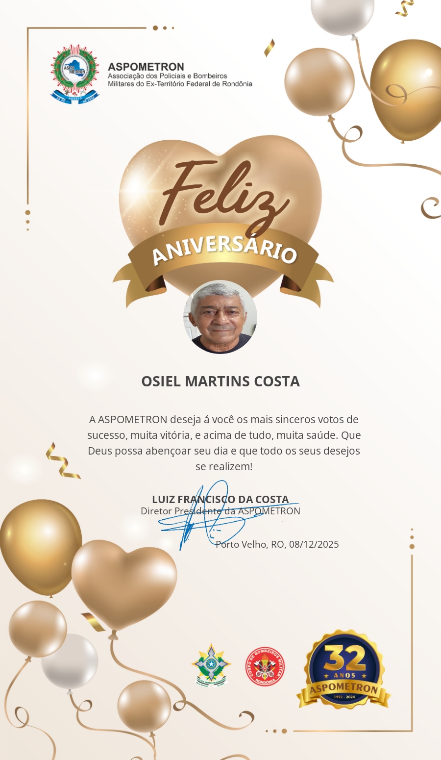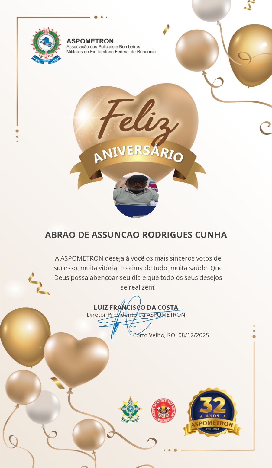 A ASPOMETRON lhe saúda pela passagem de mais um aniversário e deseja muito sucesso, saúde e alegrias! PARABÉNS Guerreiros(as)!