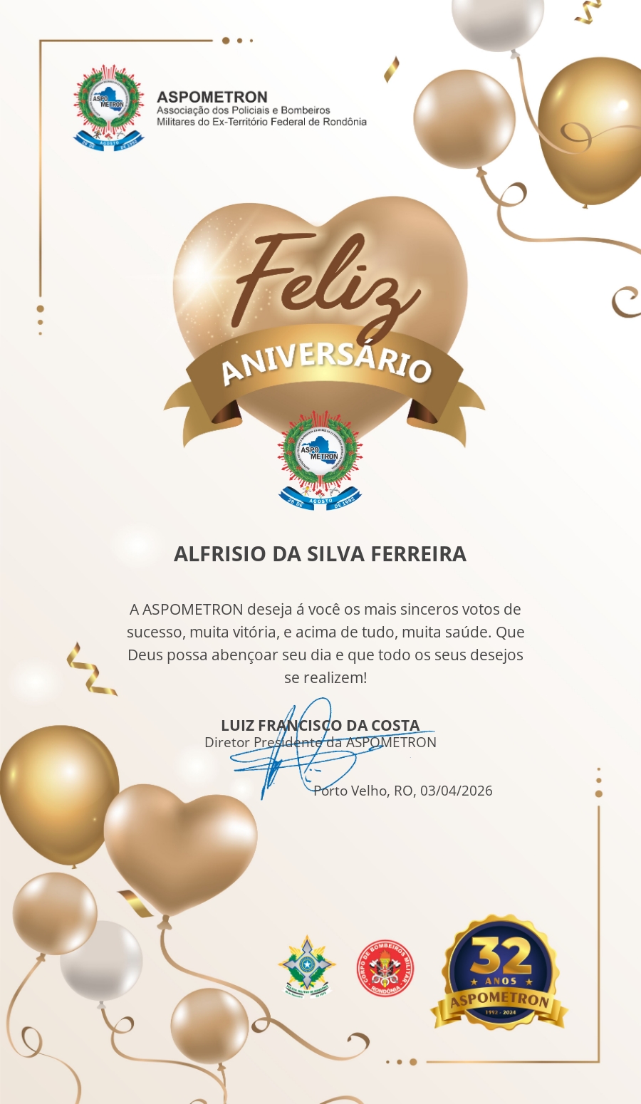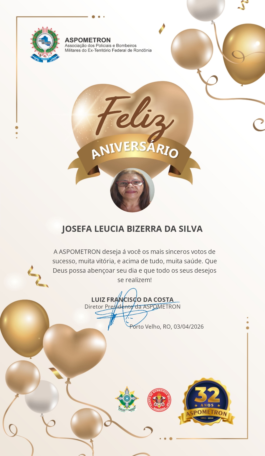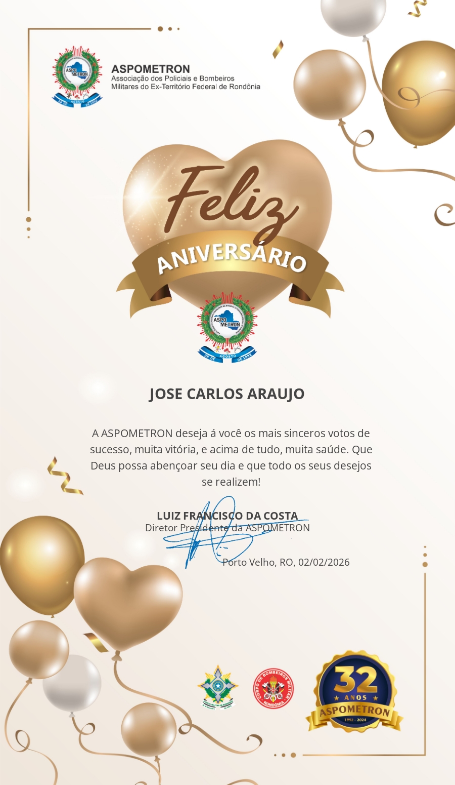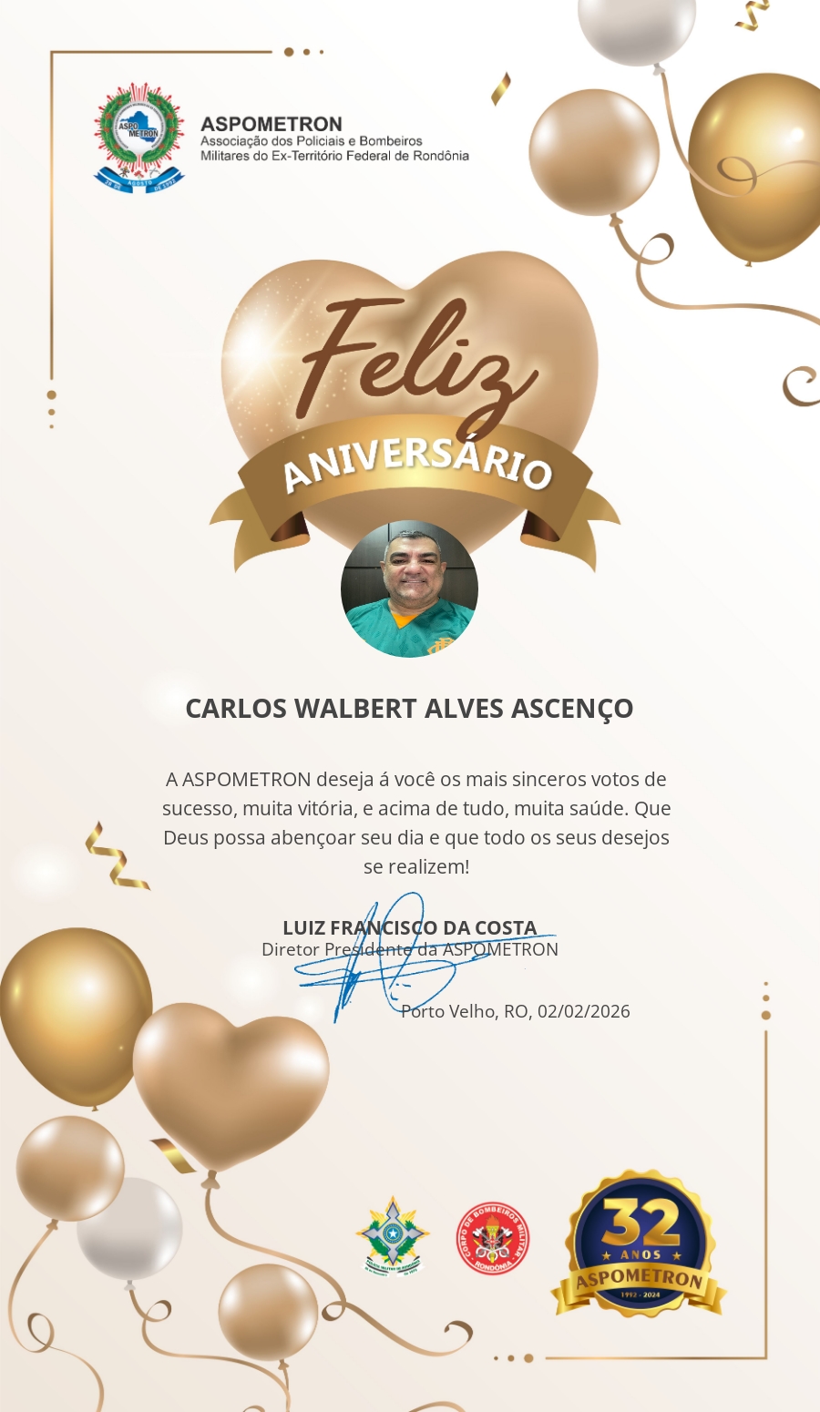 A ASPOMETRON lhe saúda pela passagem de mais um aniversário e deseja muito sucesso, saúde e alegrias! PARABÉNS Guerreiros(as)!