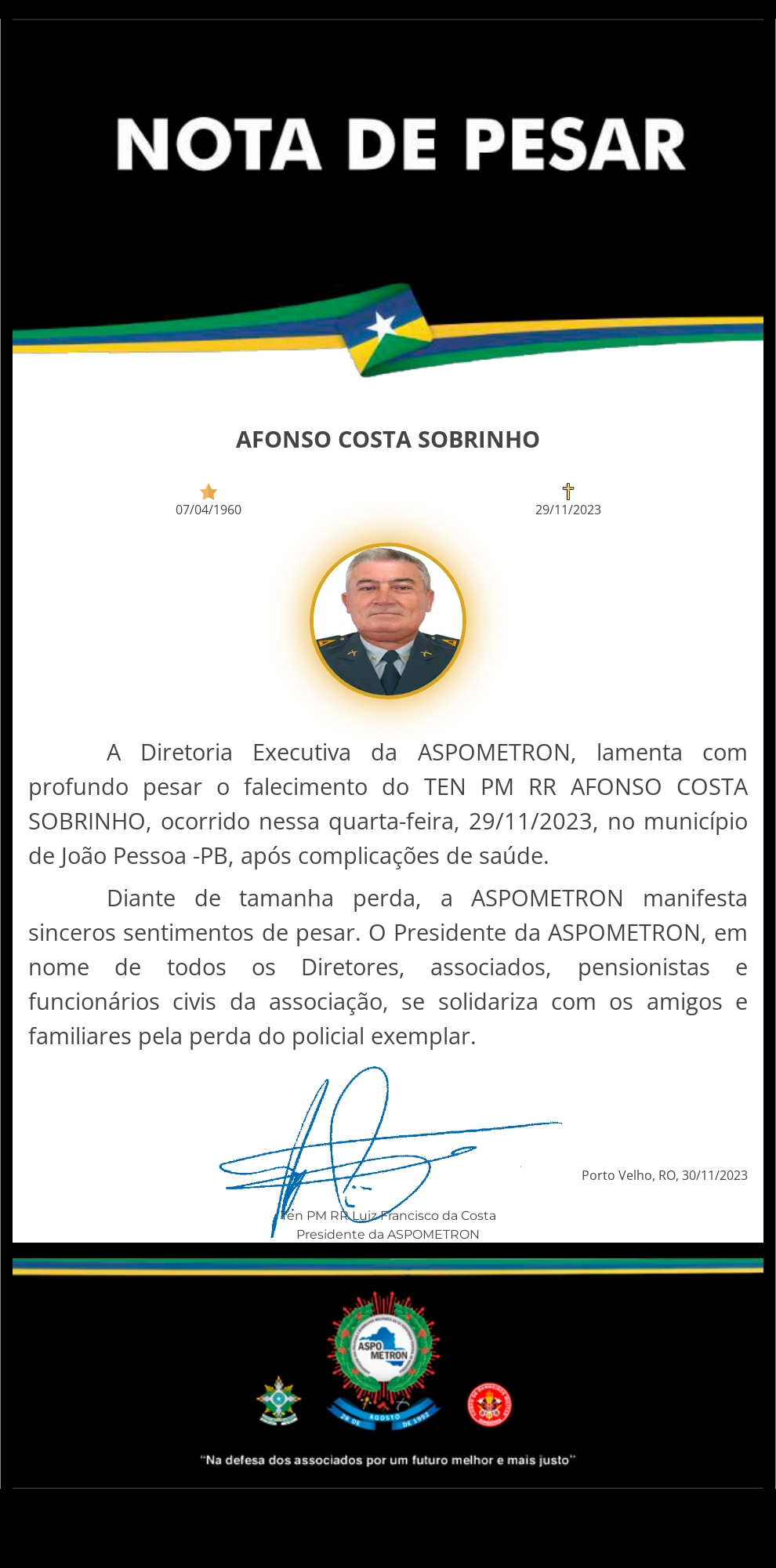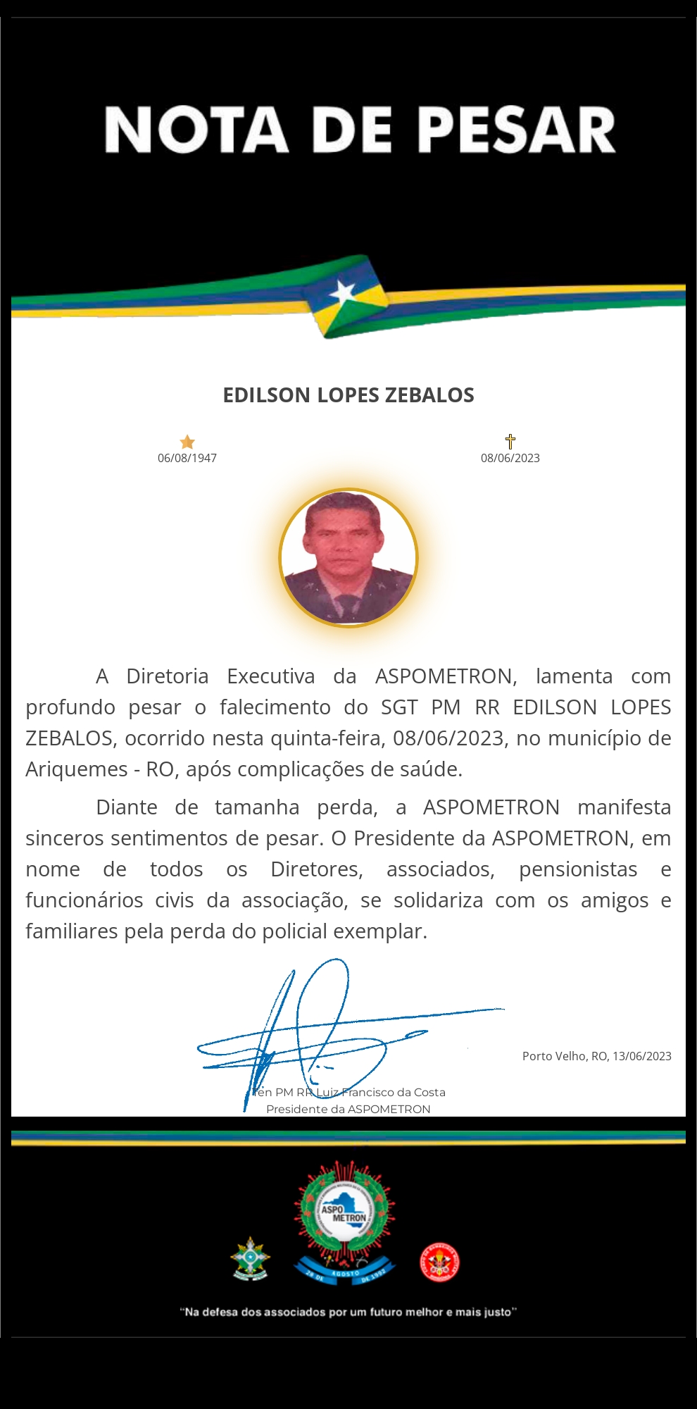 Conheça a atual Diretoria da Associação dos Policiais e Bombeiros Militares do Ex-Território Federal de Rondônia - ASPOMETRON