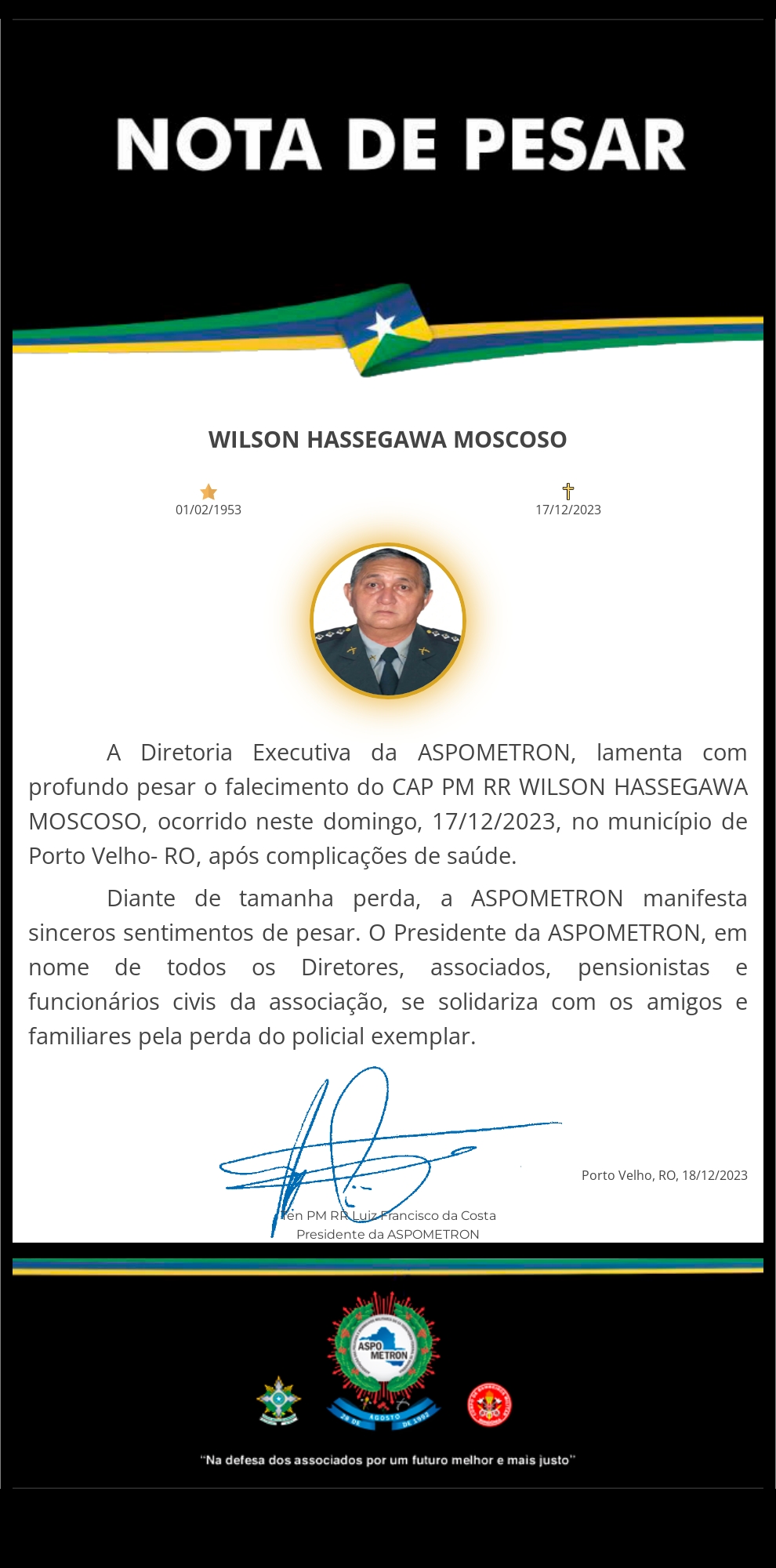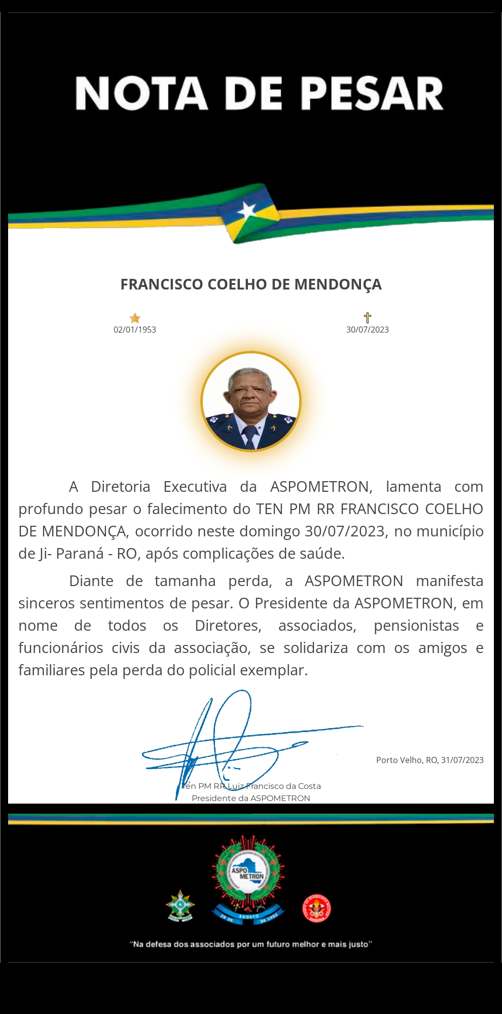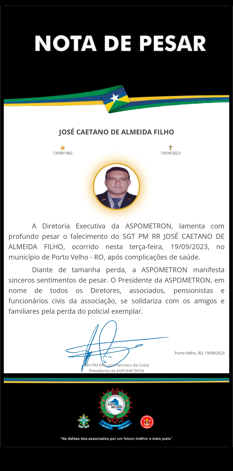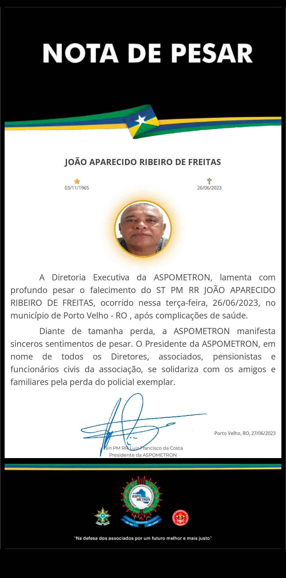 A ASPOMETRON apresenta sua solidariedade à família enlutada!