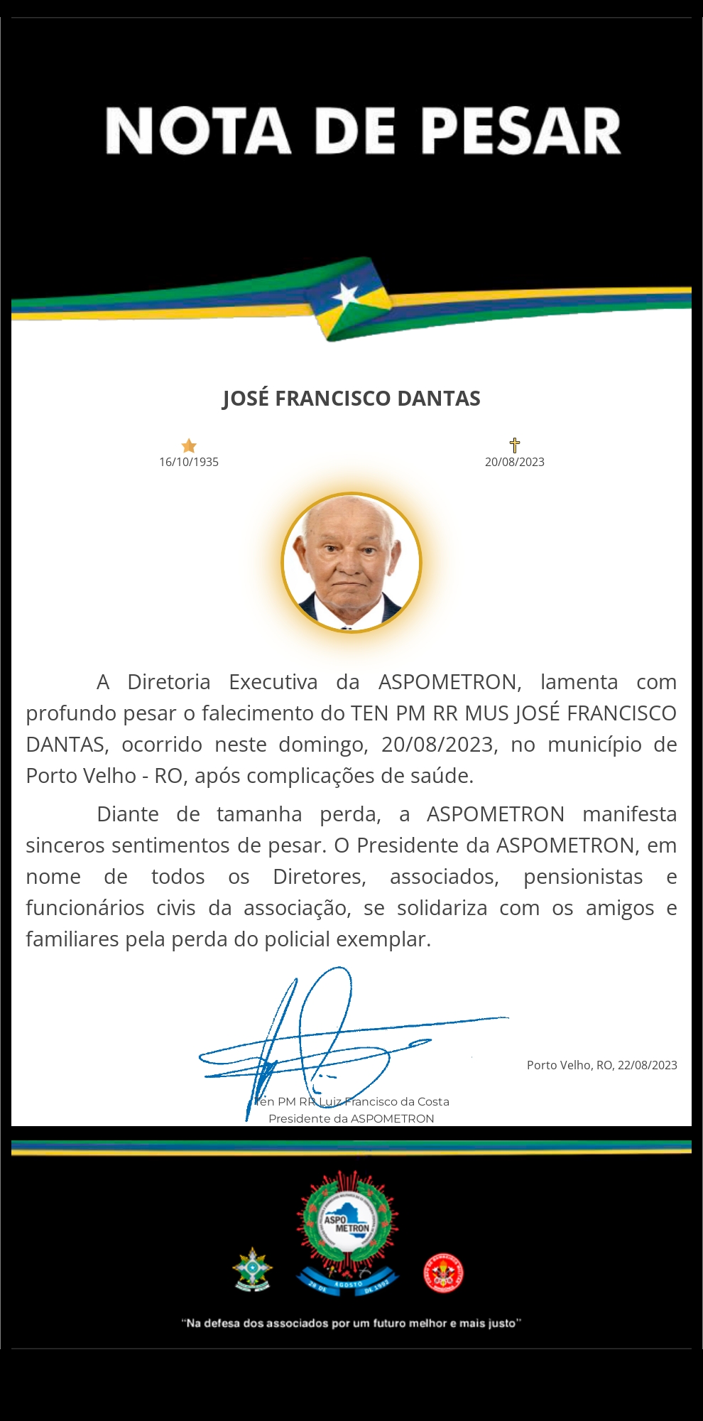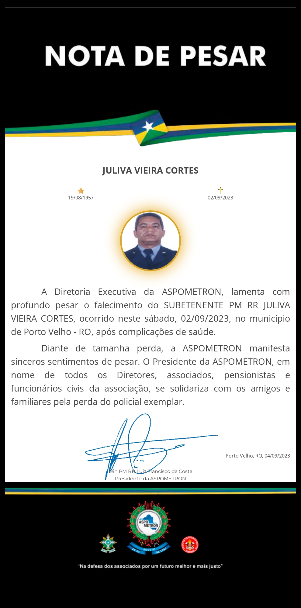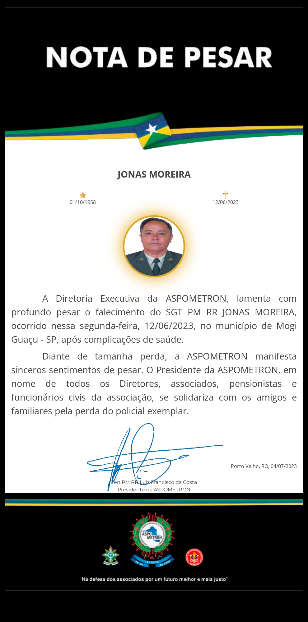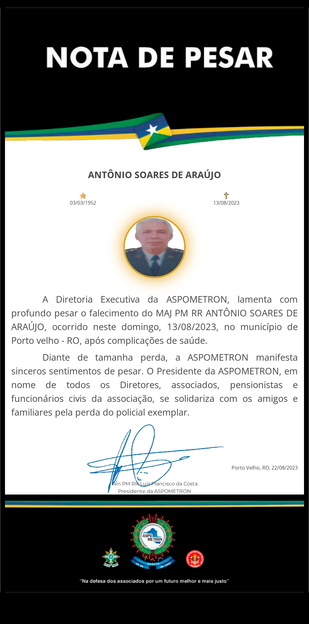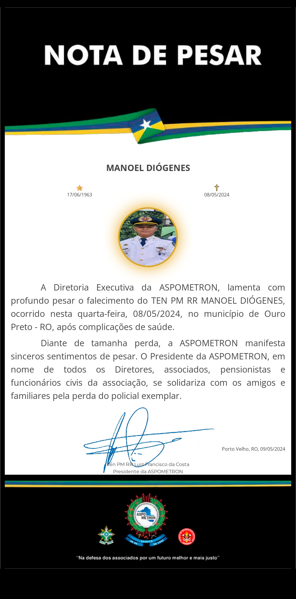A ASPOMETRON apresenta sua solidariedade à família enlutada!